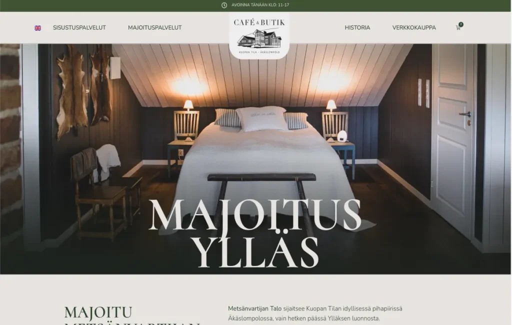 Pääsimme toteuttamaan Kuopan tilalle tyylikkään verkkosivuston ja verkkokaupan. Cafe & Butik Kuopan Tila on viihtyisä kahvila sekä inspiroiva sisustus- ja lifestyle-myymälä Ylläksen sydämessä.